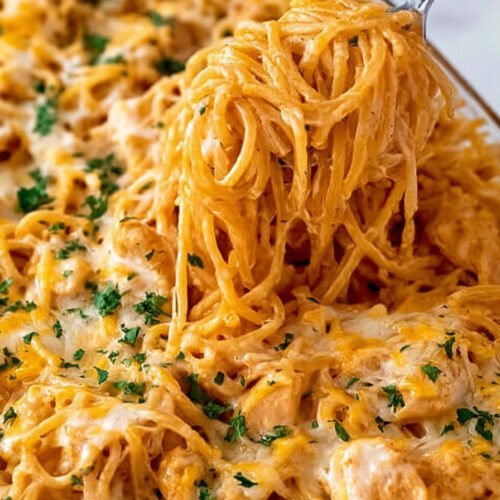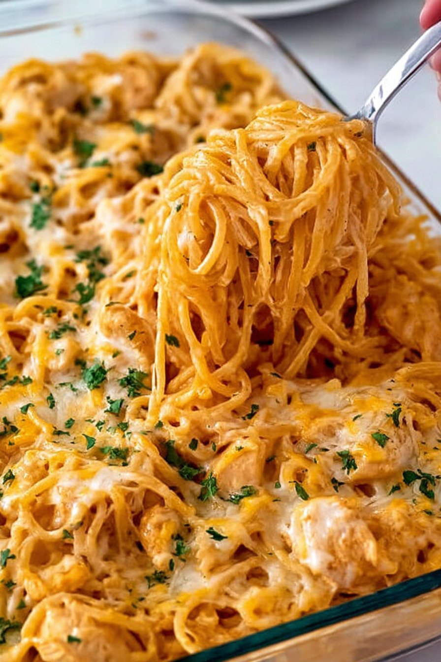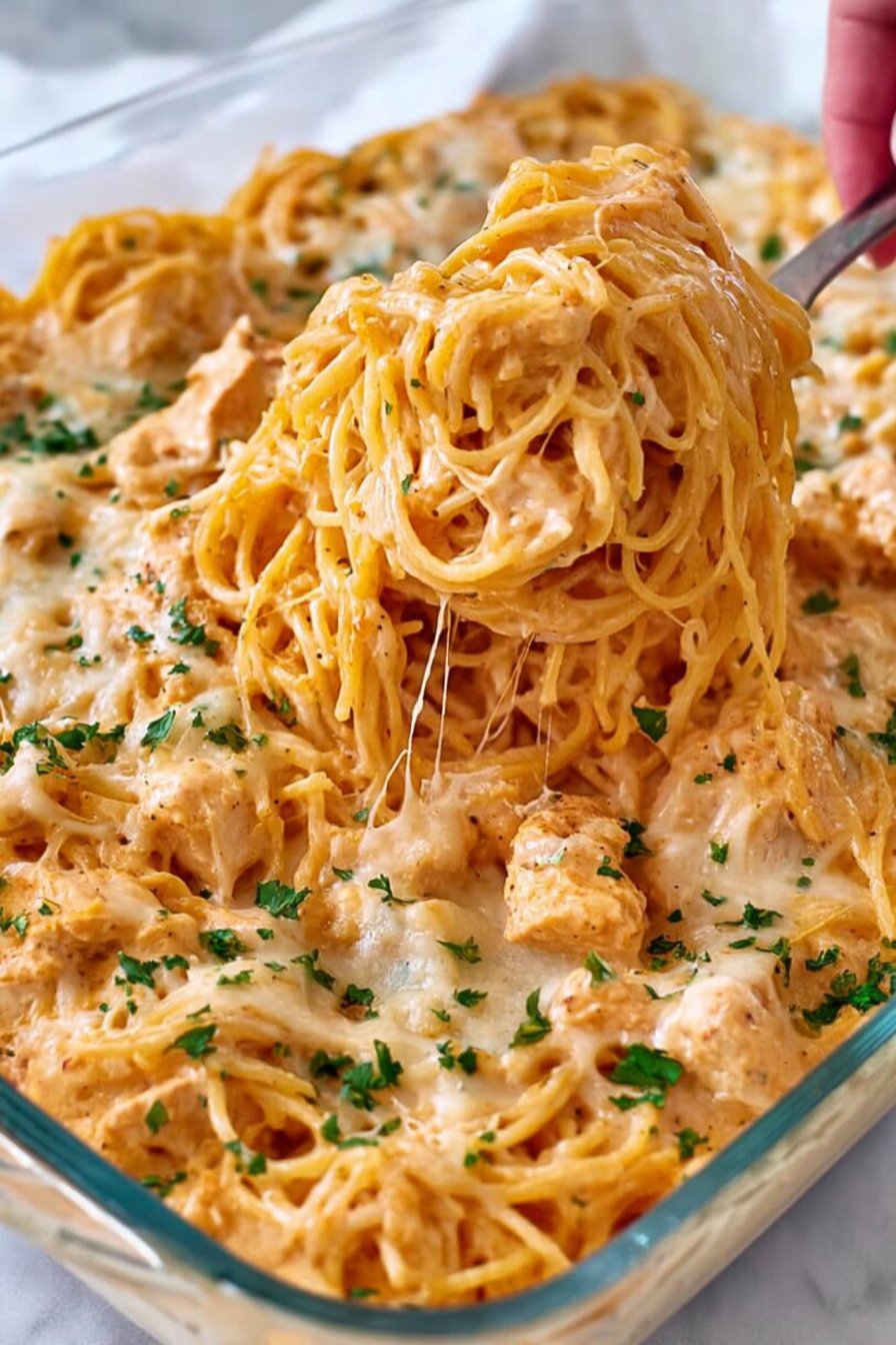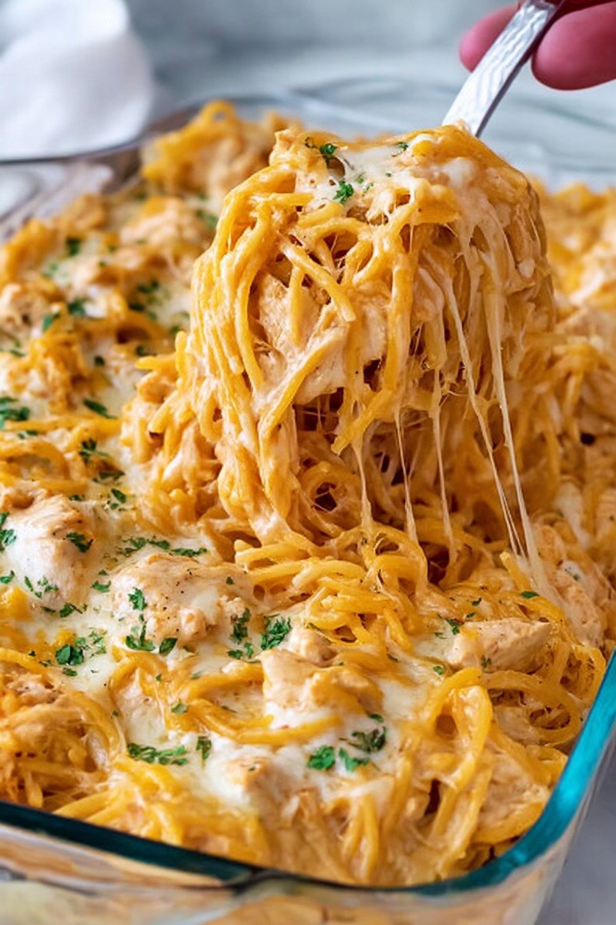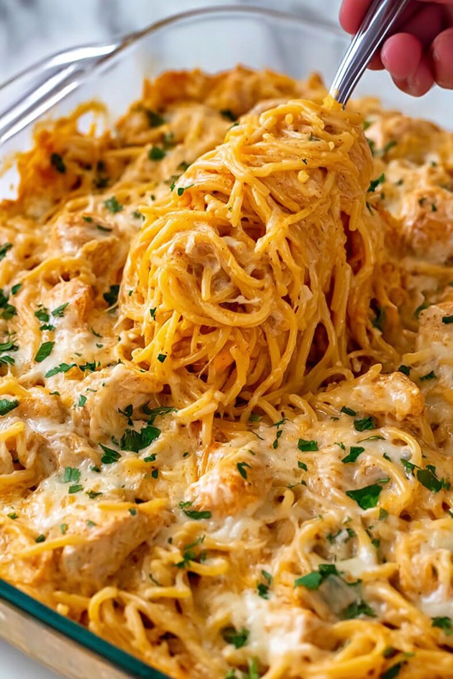 If you are looking for comforting Chicken Pasta Recipes that feel hearty, creamy, and easy enough for a busy weeknight, this chicken spaghetti is a perfect choice. It brings together tender chicken, flavorful sauce, and melty cheese in a way that makes it one of those Baked Pasta Recipes you will want to keep on repeat. The rich, cozy texture also gives a little nod to Alfredo Pasta Recipes, while still keeping the dish simple and family-friendly. One of the best things about this dinner is how flexible it is. You can use shredded or diced Baked Chicken, or start with juicy meat prepared from your favorite Boneless Skinless Chicken Breast Recipes for a reliable and satisfying result. Even though this dish is oven-finished, it fits beautifully into a meal plan that already includes Air fryer recipes chicken, making it easy to repurpose cooked chicken into something warm, cheesy, and delicious. This recipe is ideal when you want classic Chicken Pasta Recipes with a baked twist that feels special without being complicated. The spaghetti bakes up bubbly and golden, giving you the same comforting appeal people love in Baked Pasta Recipes, while the creamy, savory finish reminds you why Alfredo Pasta Recipes are always such a hit. Whether you are serving it for a casual family meal or prepping ahead for the week, this is one of those Chicken Pasta Recipes that always delivers.
