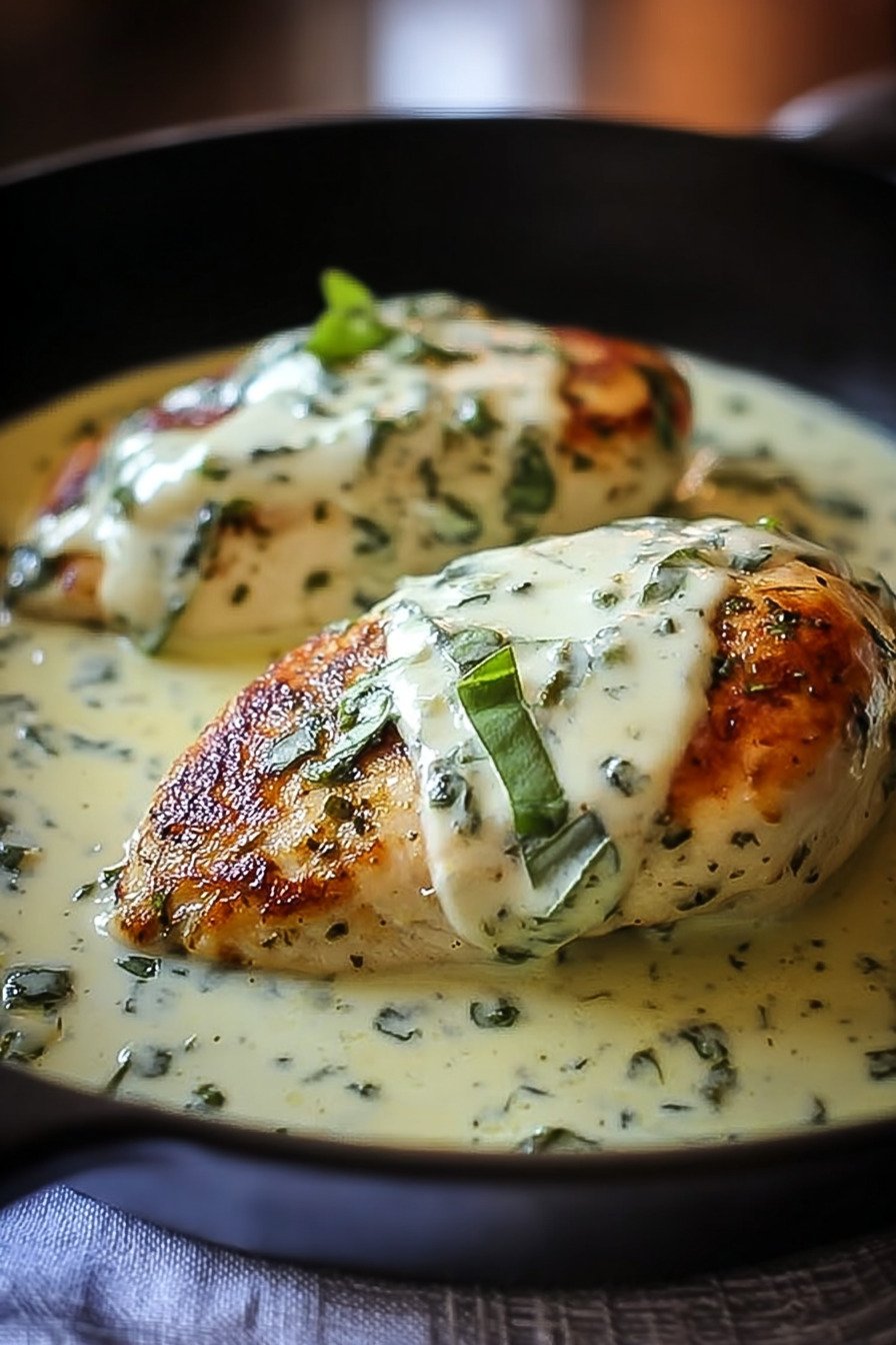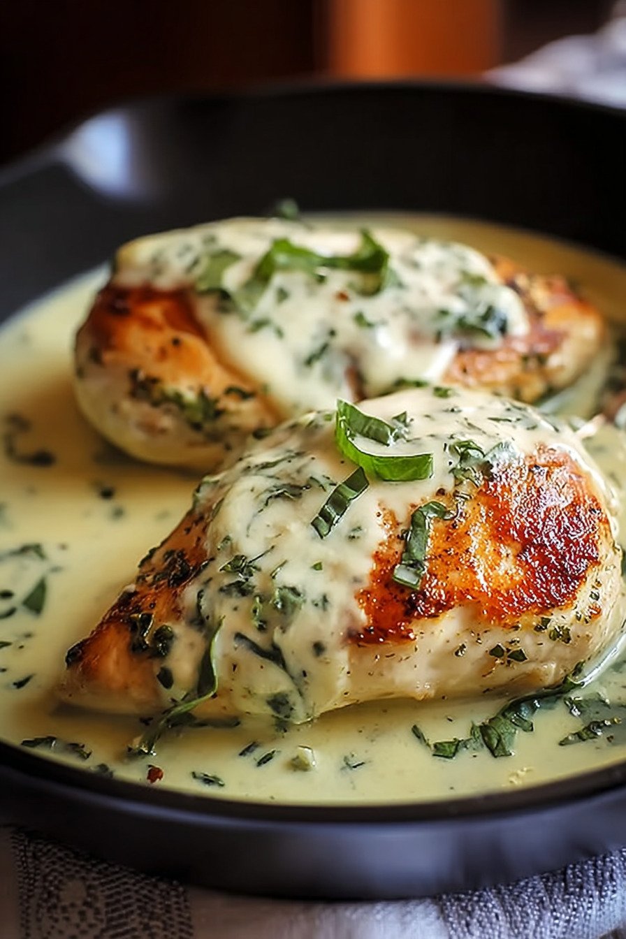 Warm gently in a pan. Add a small splash of broth to loosen. Stir until the sauce turns smooth again. Add fresh basil for a clean finish. The cheese will relax and coat the chicken.