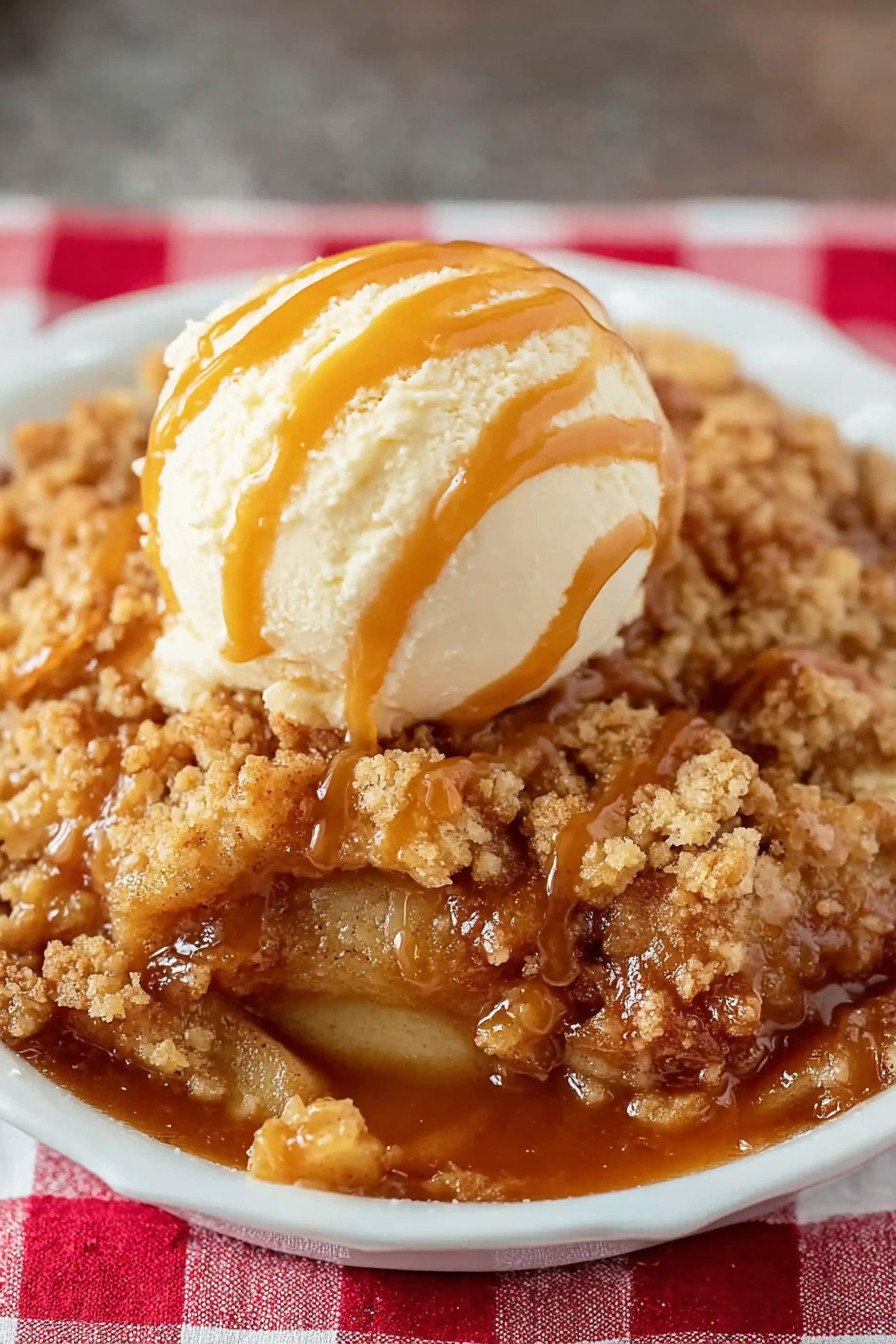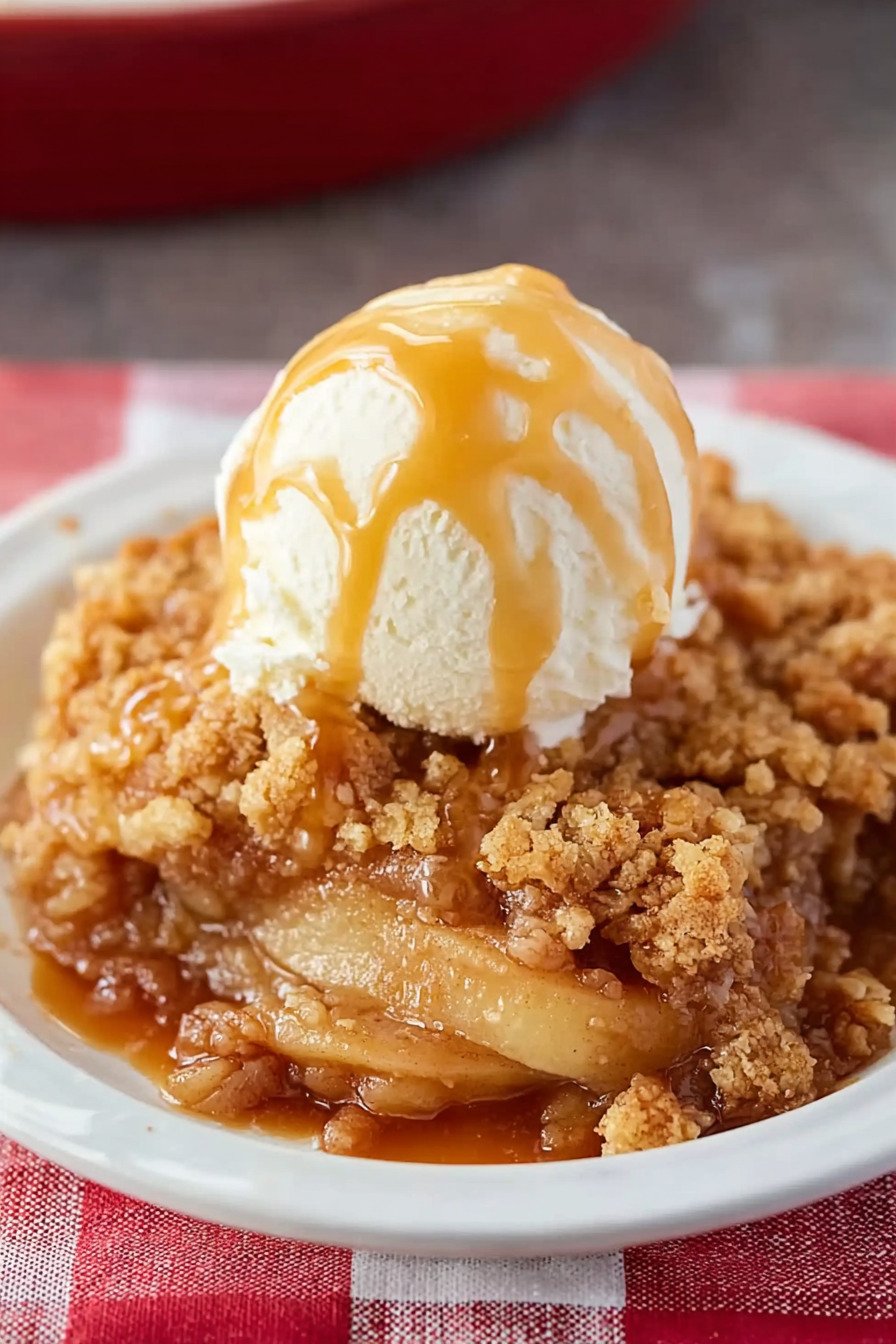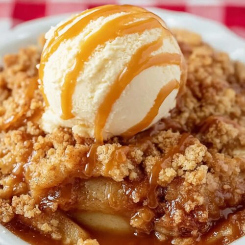 I bake it in the morning for a late dinner. The pan cools on the counter. The top holds a gentle crunch and the apples set. Right before serving I warm portions until the caramel loosens again.