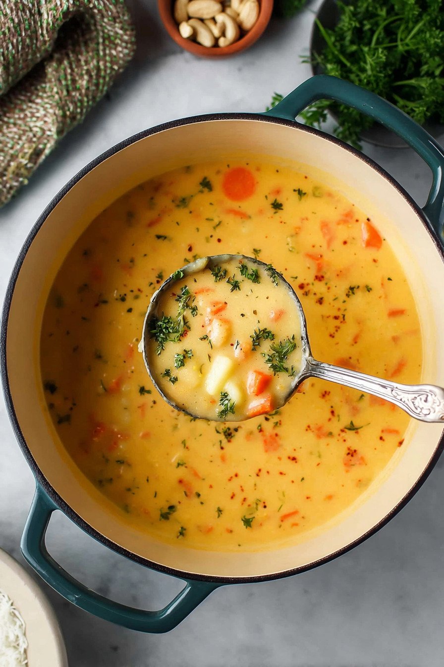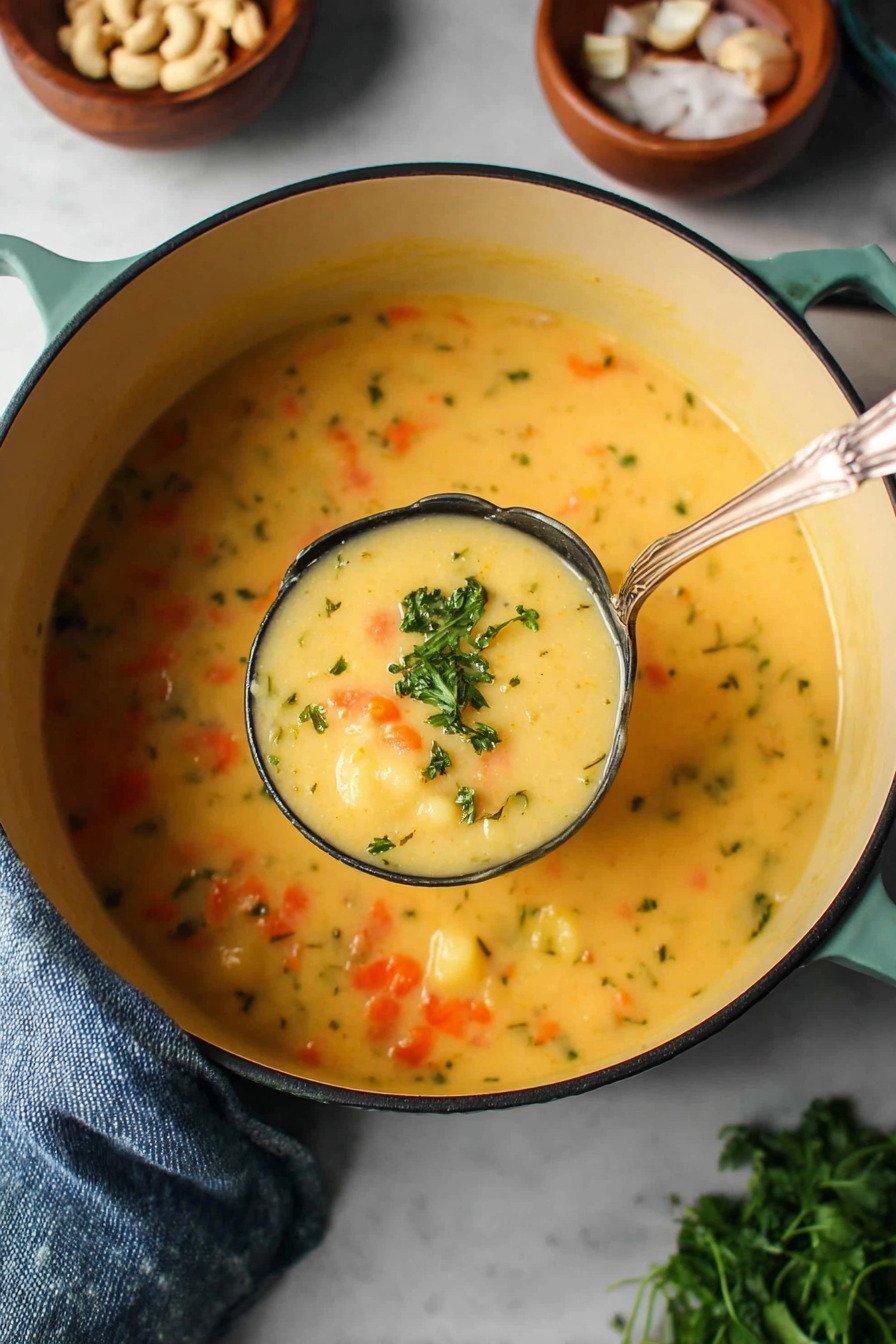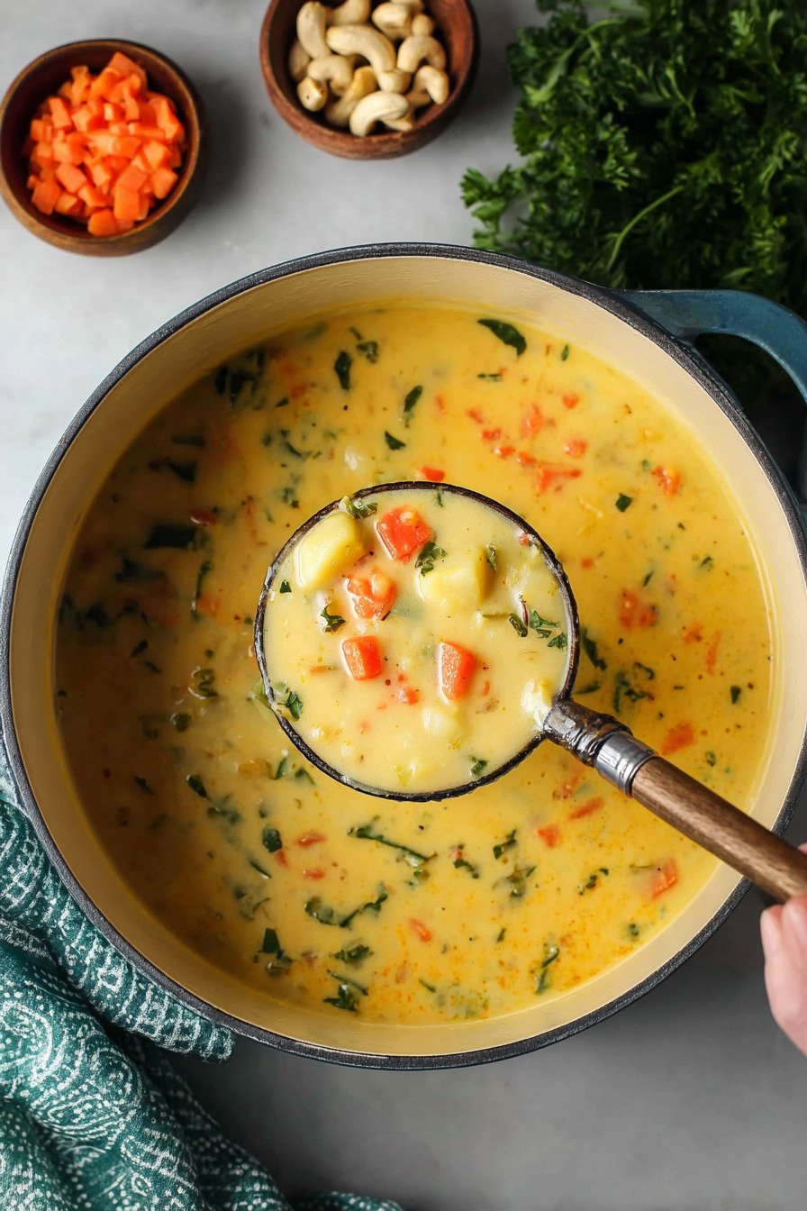 The method stays short so you can keep the kitchen relaxed. Chop the onion and garlic. Slice the carrots. Cube the potatoes. Heat oil then cook the aromatics until they smell sweet. Add broth and bring a low simmer that hums.