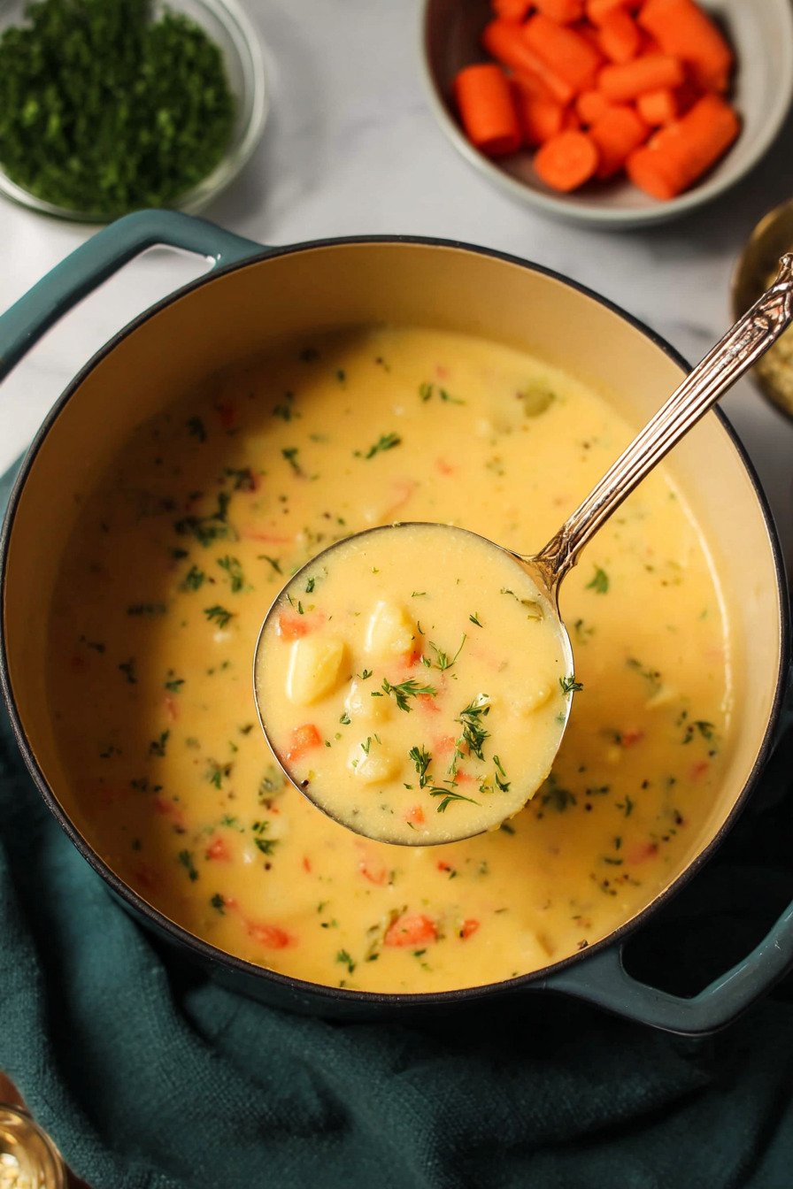 Blend only part of the soup. That move keeps texture and avoids a heavy feel. If you want easy potato soup just blend more for extra smooth body.