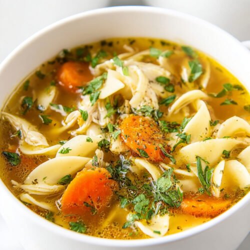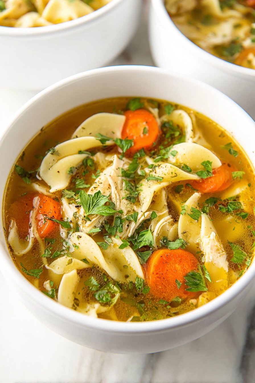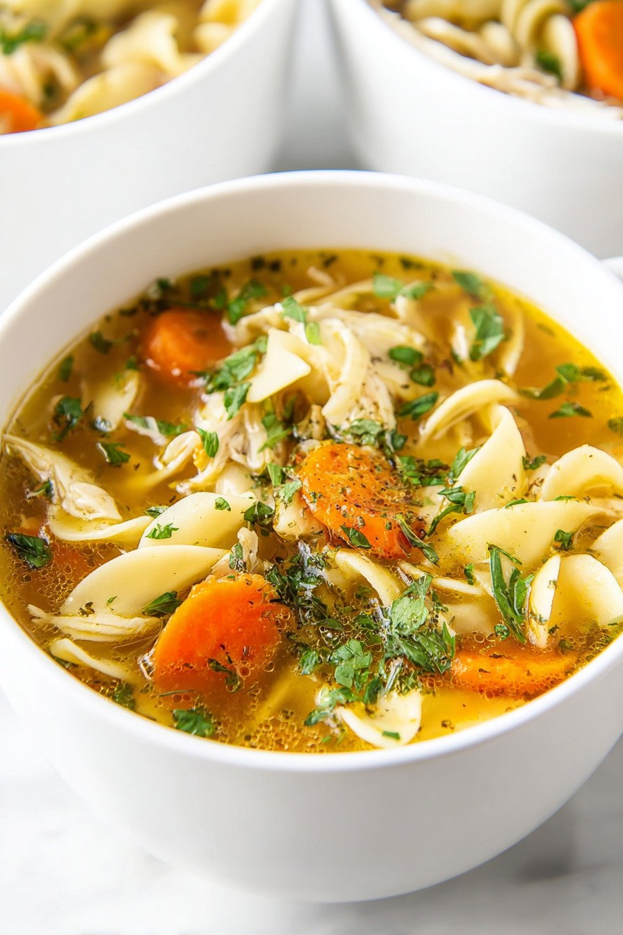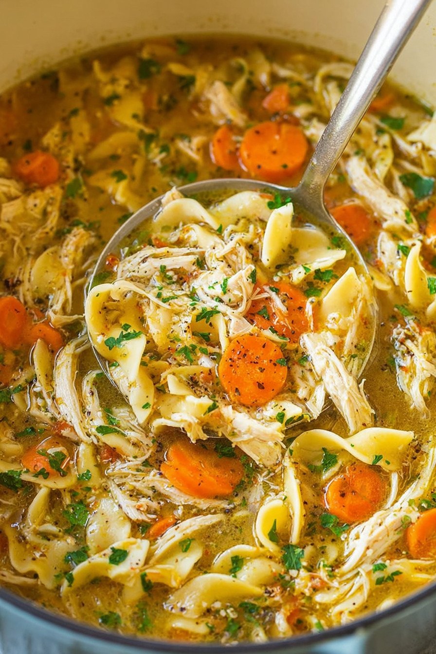 This soup cooks low and slow while we live life. Tender chicken rests in rich broth. Noodles stay soft yet springy. The flavor feels calm and steady.
