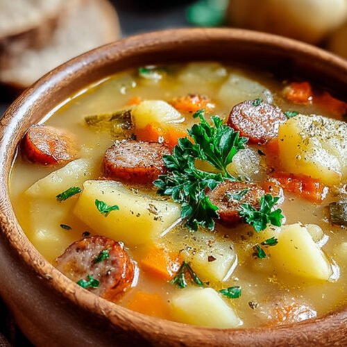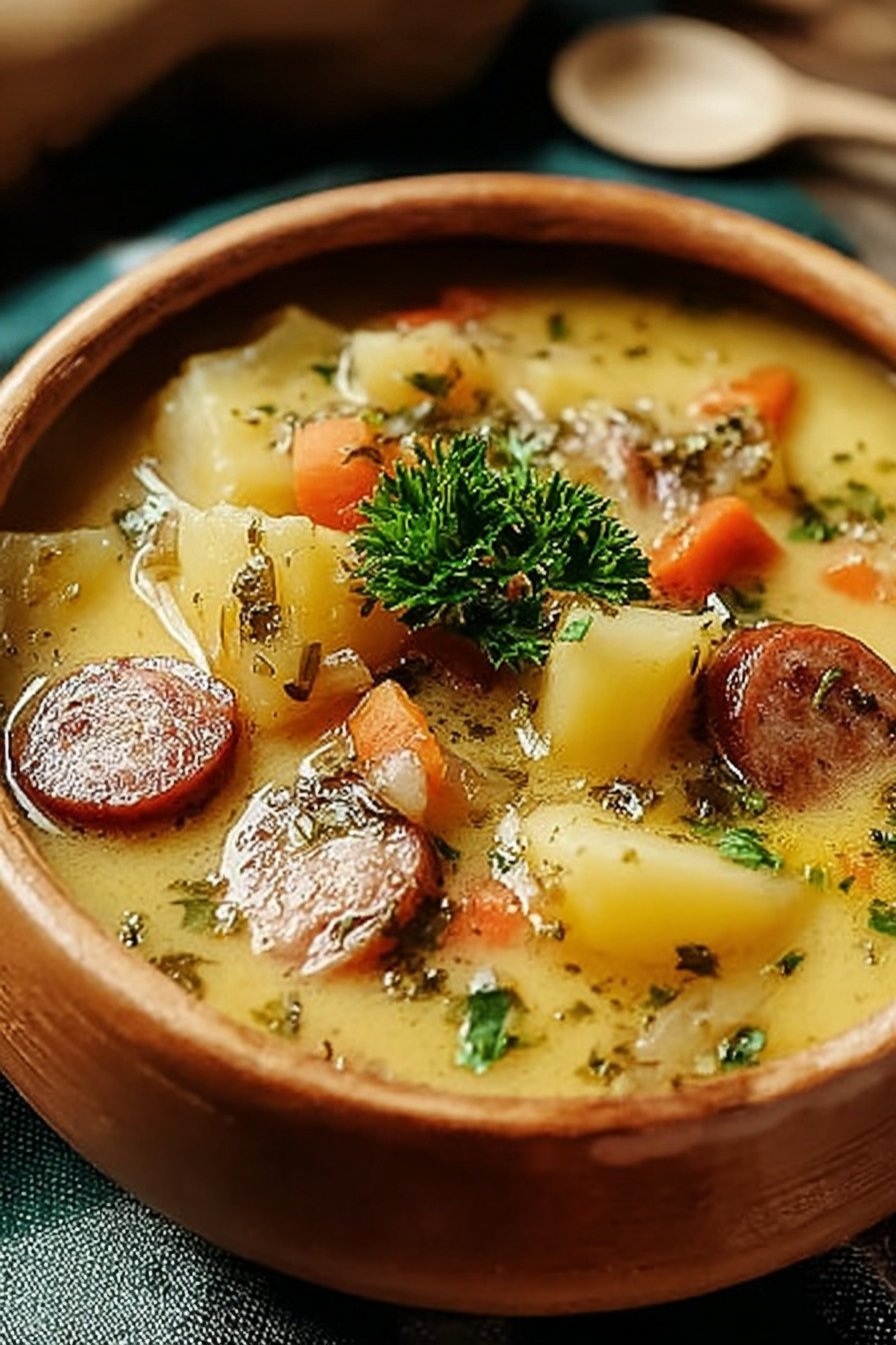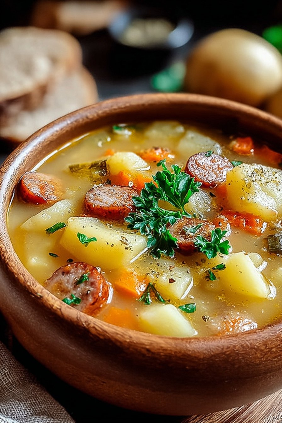 Warm soup meets an easy plan. I load the slow cooker. I let it work. I get a rich bowl by dinner. The potatoes turn creamy. The sausage brings a little snap. The broth stays light yet full. The spoon keeps moving and the room stays quiet. That is how a good soup should feel.