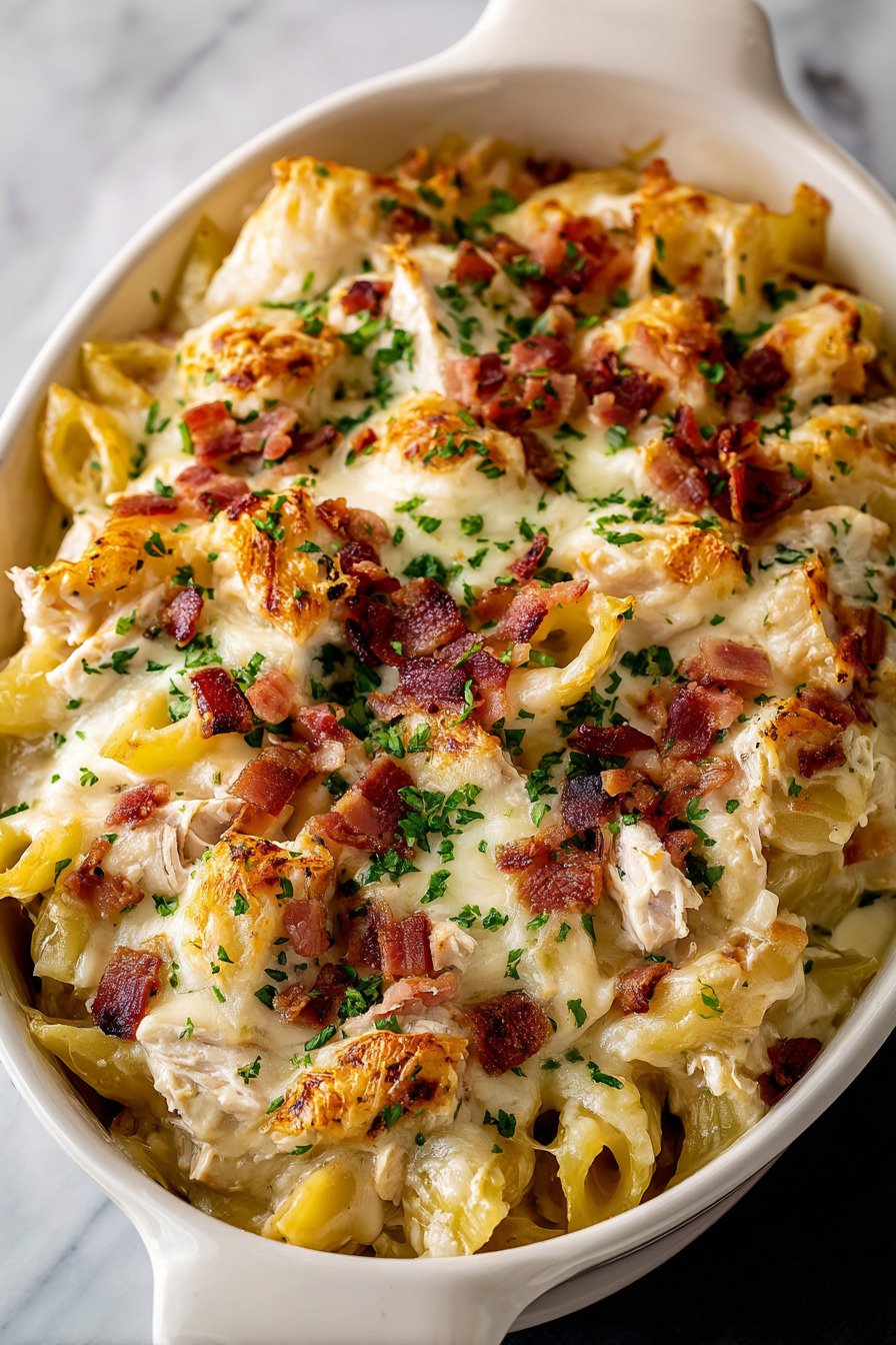 Hi I am Nancy from Nancy Cooks and I keep this one ready for weeknights when the fridge looks tired and everyone expects magic. This is one of my Chicken Pasta Recipes that never lets me down. Think creamy sauce and tender noodles and a golden top that whispers eat me now. We build it like our favorite Baked Pasta Recipes only quicker. I lean on Baked Chicken Breast Recipes for clean flavor then fold the meat into a silky mix that nods to Alfredo Pasta Recipes. If the oven is busy I use the air fryer for crisp bacon which sneaks in a wink to Air fryer recipes chicken. Boneless Skinless Chicken Breast Recipes and Boneless Skinless Chicken Thigh Recipes both work here so use what you have. I learned this dish on a night when homework sprawled and the dog stared at the stove like it knew a secret. The first forkful went creamy and warm and the table went quiet which felt like a small win. You stir you bake you scoop and we all eat well. Leftovers reheat like a dream which means lunch smiles back tomorrow.