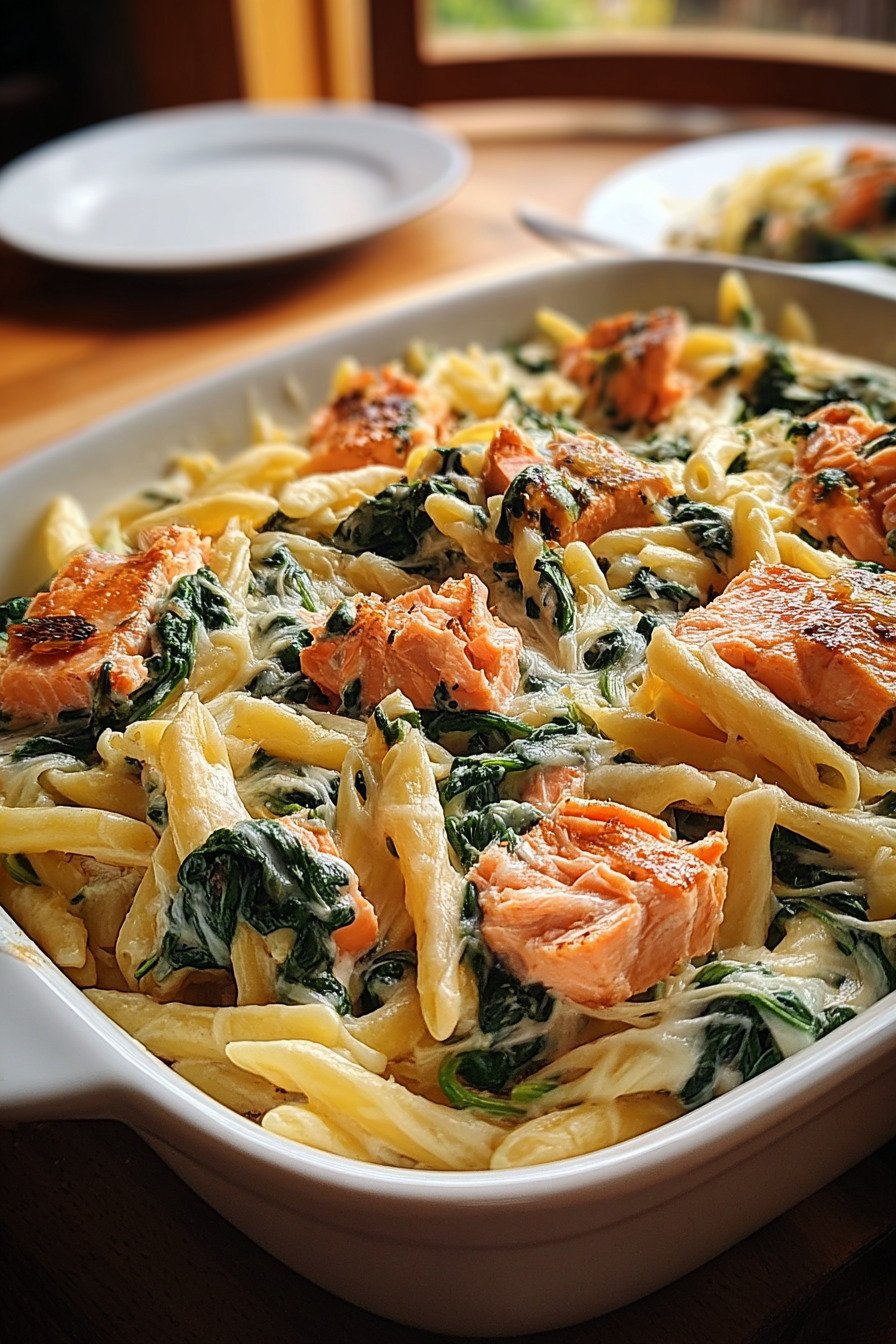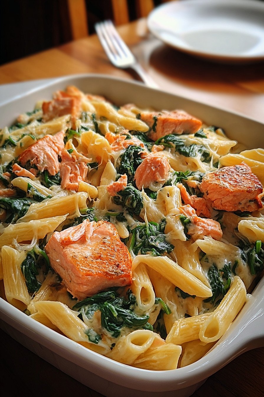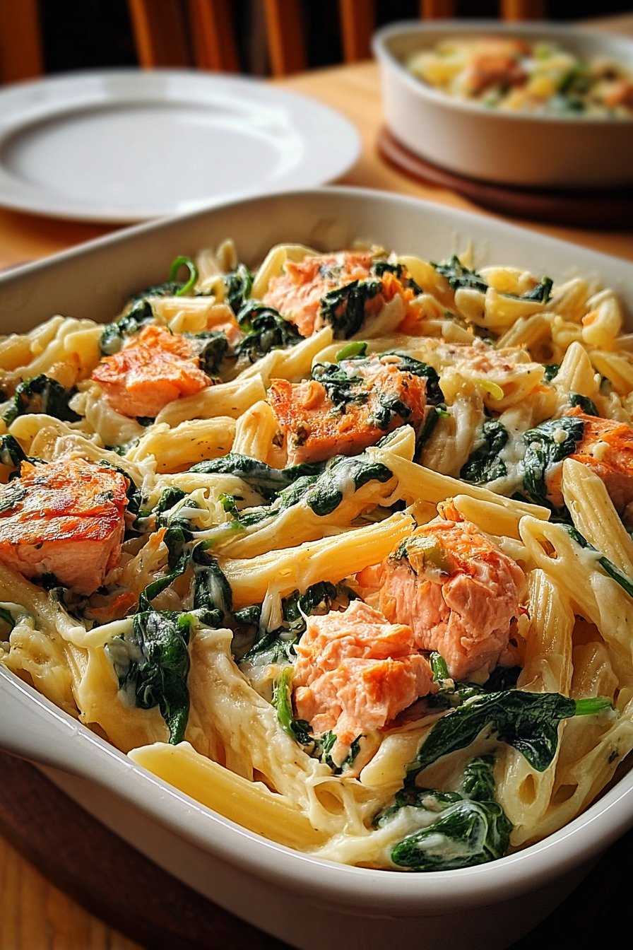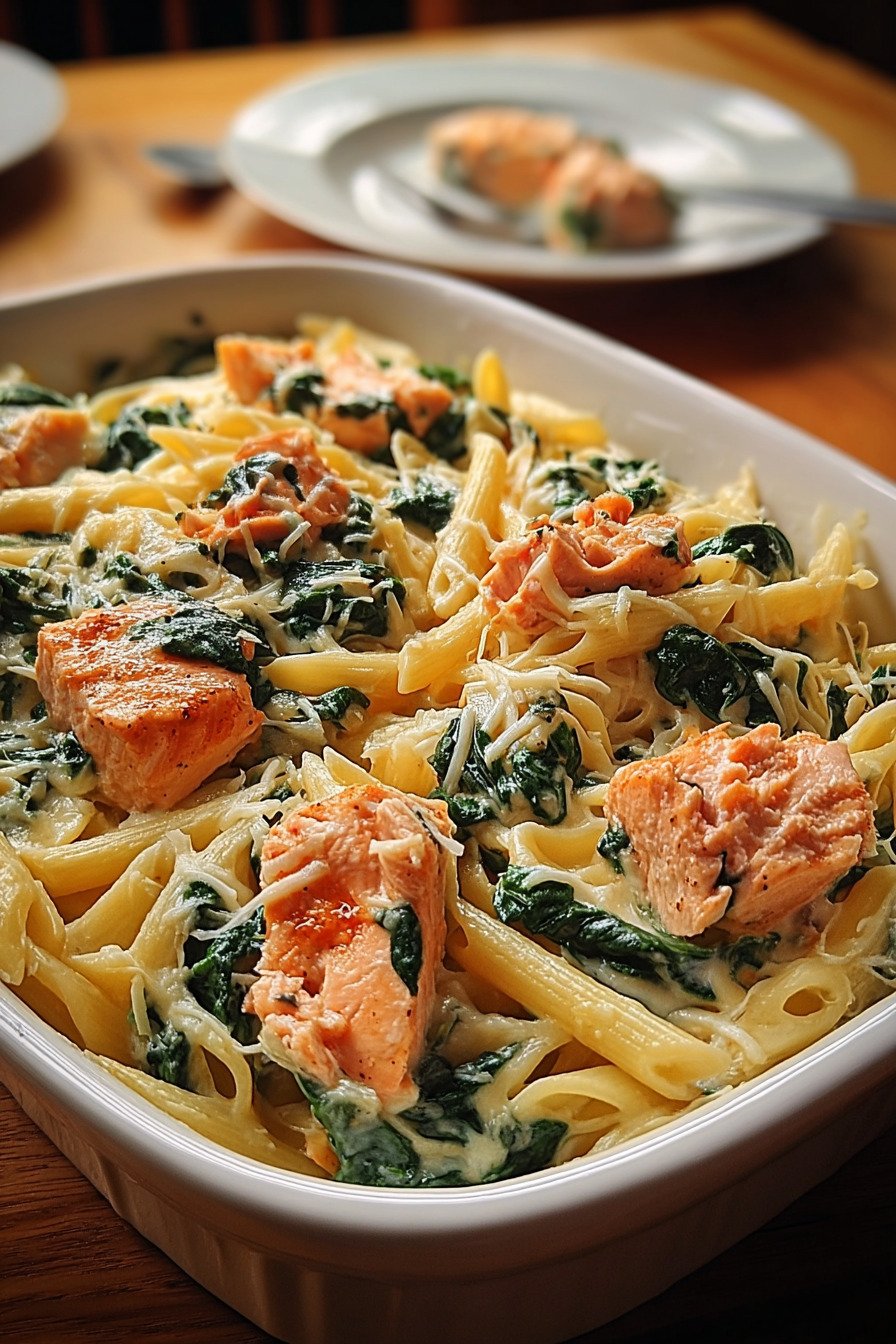 If you’re searching for comforting yet nutritious spinach dinner recipes, this Spinach Salmon Pasta is the perfect choice. It combines tender salmon, fresh spinach, and creamy pasta into a dish that feels indulgent while still being wholesome. Whether you’re exploring new Alfredo Pasta Recipes or looking to upgrade your weeknight meals, this recipe delivers both flavor and simplicity. This dish also fits beautifully into collections of Baked Pasta Recipes and Baked Dinner Ideas, especially if you choose to finish it in the oven for a golden, bubbly top. While it leans toward classic American Dinner Recipes, the versatility of the ingredients allows you to add subtle flavors inspired by Asian Dinner Recipes, making it adaptable to your taste preferences. Perfect for busy evenings, this recipe can even be modified into one of your favorite air fryer dinner recipes by preparing the salmon in the air fryer for added convenience. No matter how you make it, this Spinach Salmon Pasta is a satisfying and easy addition to your list of spinach dinner recipes.