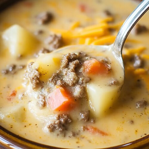 We start with beef and cheddar. We add potato for body and a little milk for a soft finish. The soup tastes rich and still feels light enough for a weeknight.