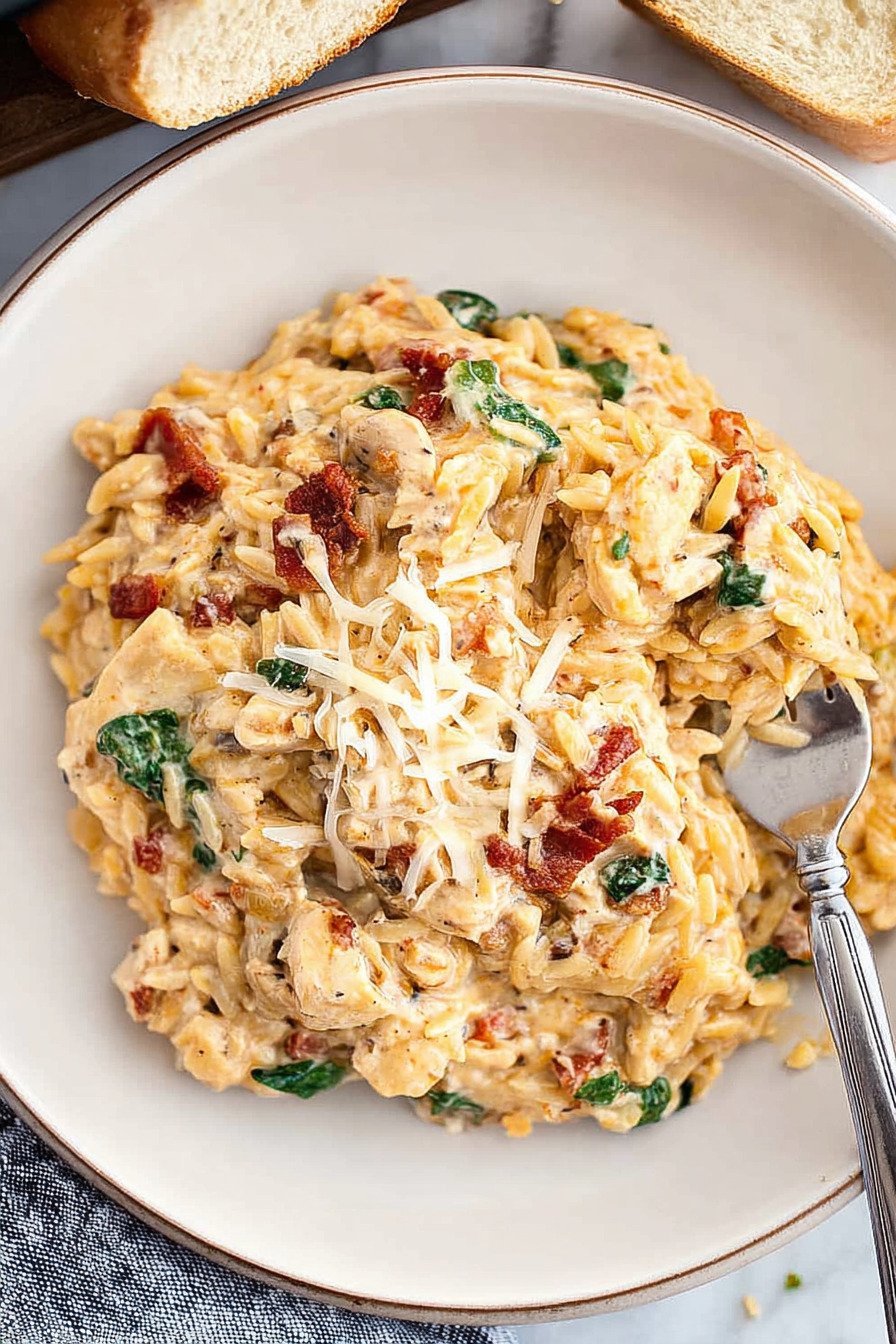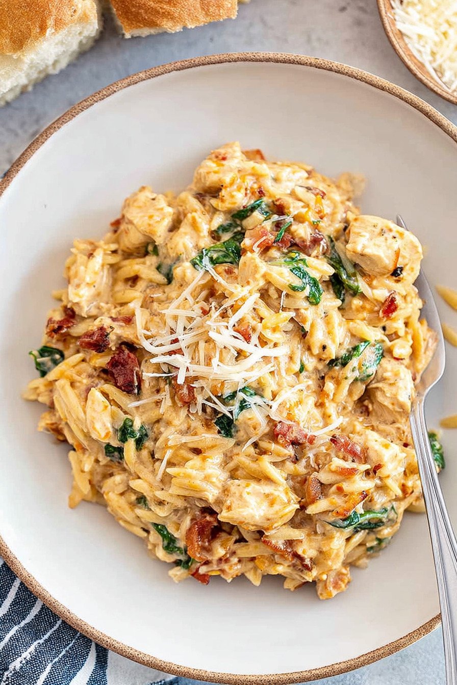 We cook with low effort and high comfort. Chicken turns tender. Orzo turns soft with a tiny bite. Cream brings body. Spinach adds color. Sun dried tomatoes add a sweet tang. Parmesan lands at the end for a nutty finish. The pot stays mostly hands off which we like after work or after a long errand loop.