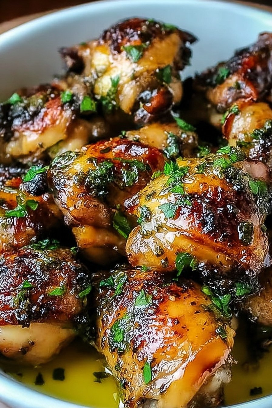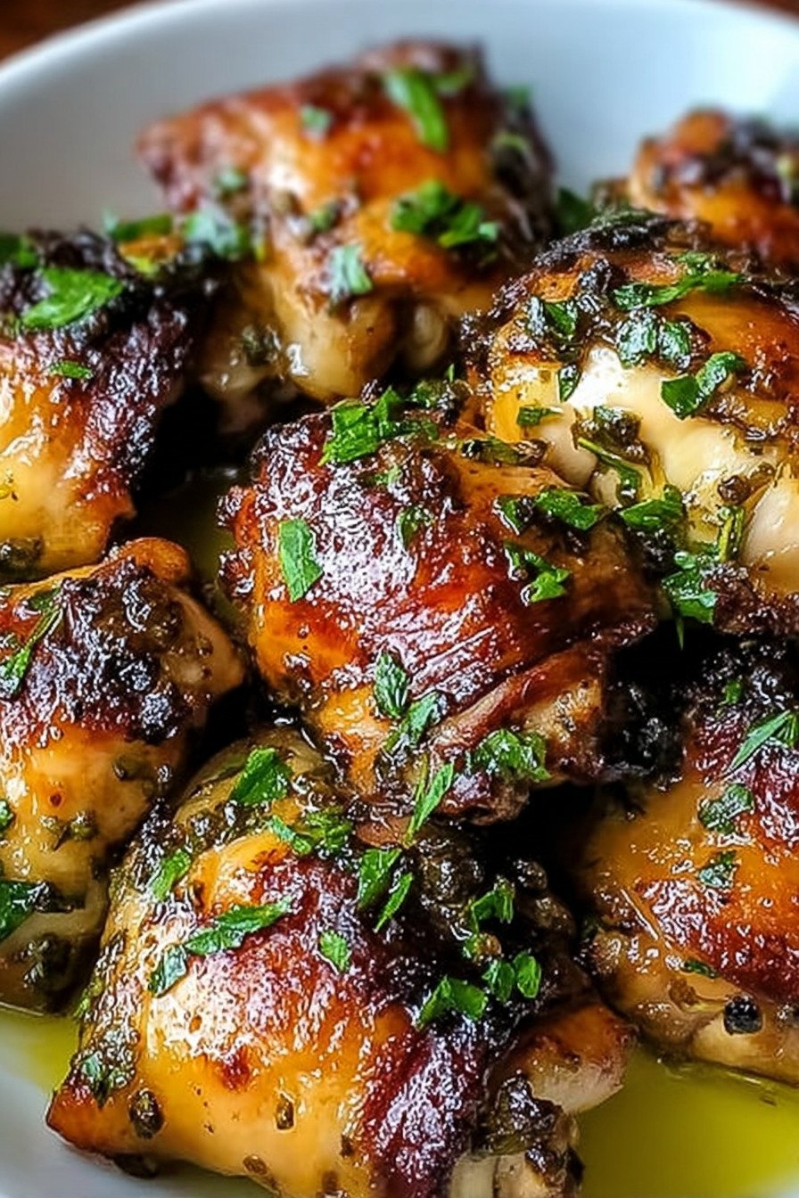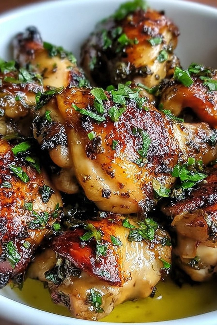 Chicken thighs I use bone in skin on pieces for flavor and moisture. The skin protects the meat and turns crisp under steady heat. Four to eight pieces fit most pans and feed a small crowd.