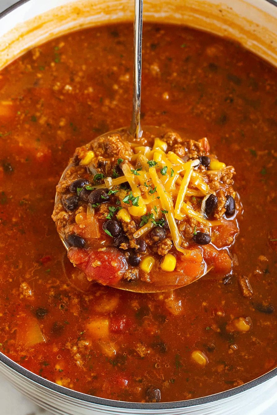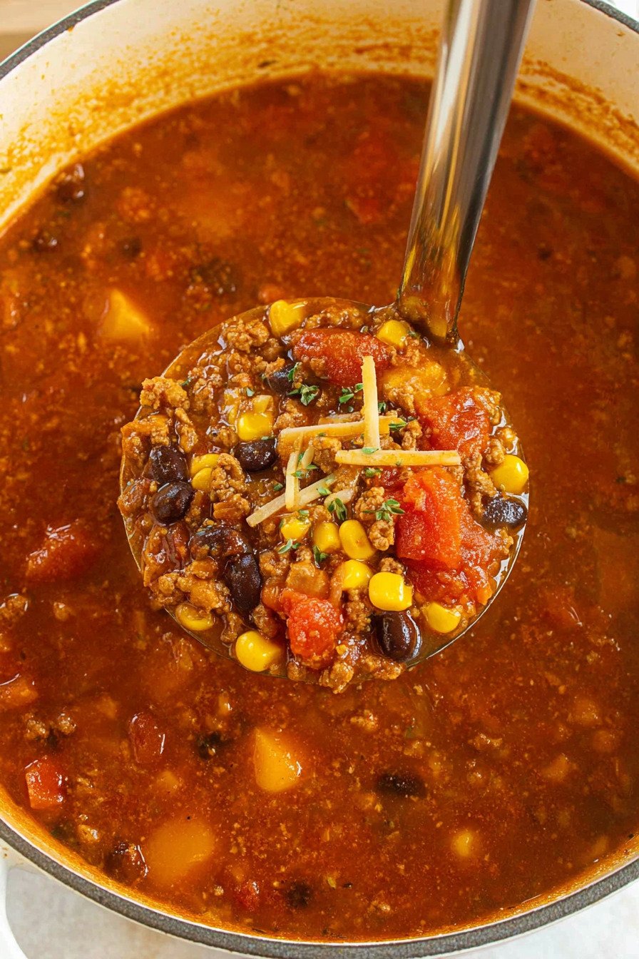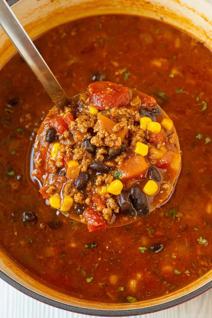 We brown the beef, stir in spice, then add beans, corn, and tomatoes. That is it. The pot simmers and the broth turns into a spicy beef soup that clings to every spoonful. I stand there with a ladle and sneak a taste. Then another. No one sees that part.