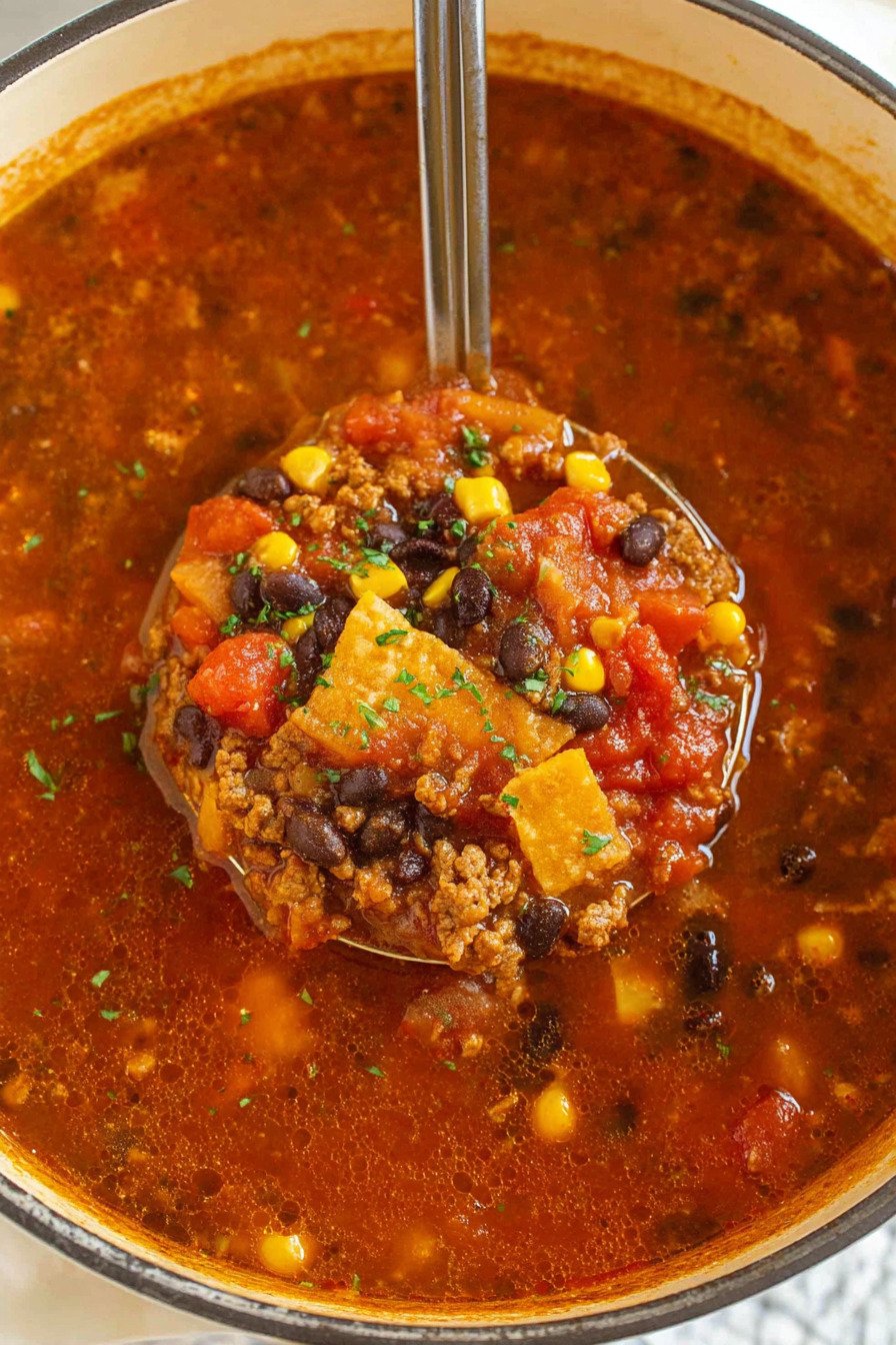 Serve with toppings. Crushed chips add crunch. A spoon of sour cream cools the heat. If you want more spice, add chopped jalapeno. Small changes make the soup feel new each time.