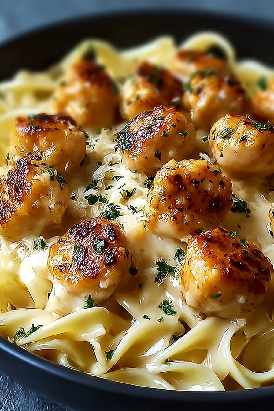 9) Garlic Butter Chicken Bites with Creamy Parmesan Pasta