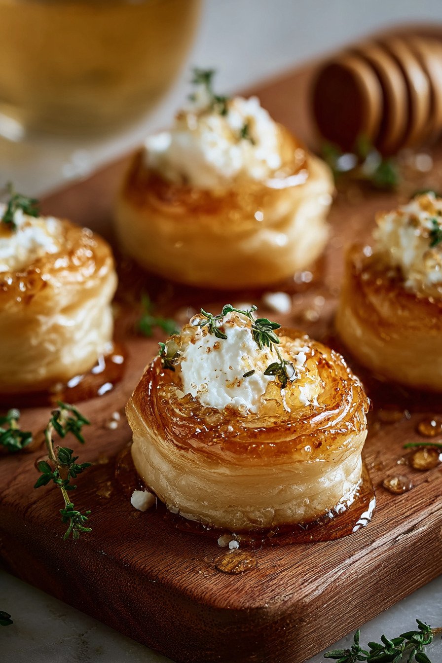 Honey waits near the pans. The drizzle lands as the bites come off the sheet so it melts into the layers. Thyme goes on last so the color stays bright. Party starters move fast from oven to board to hand and no one minds that I still wear an apron.