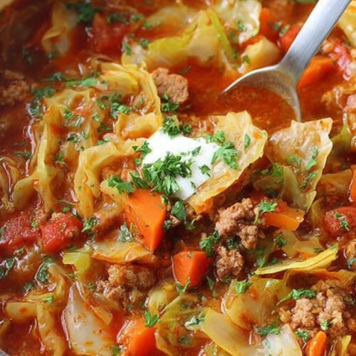 When I crave comfort food but want to keep things light, I turn to this bowl from my list of Low Calorie Soup Recipes. It fits right in with Cabbage Dinner Ideas and Cabbage Meals Dinners that fill you up without weighing you down. If you love Calorie Controlled Meals, Carb Free Recipes, and Gluten Free Recipes, this one checks every box. I grew up eating cabbage rolls at big family dinners. They took time, patience, and a lot of rolling. One night I thought, why not skip the rolling and keep the flavor. That is how this soup came to life in my kitchen. It smells like simmering tomatoes, tender beef, and sweet cabbage softening in the pot. We get all the classic taste in a simple soup that cooks in one pot. I love how the cabbage turns silky, the broth turns rich, and each spoonful feels hearty but not heavy. It is the kind of dinner we make on a weeknight when we want something warm, simple, and honest.
