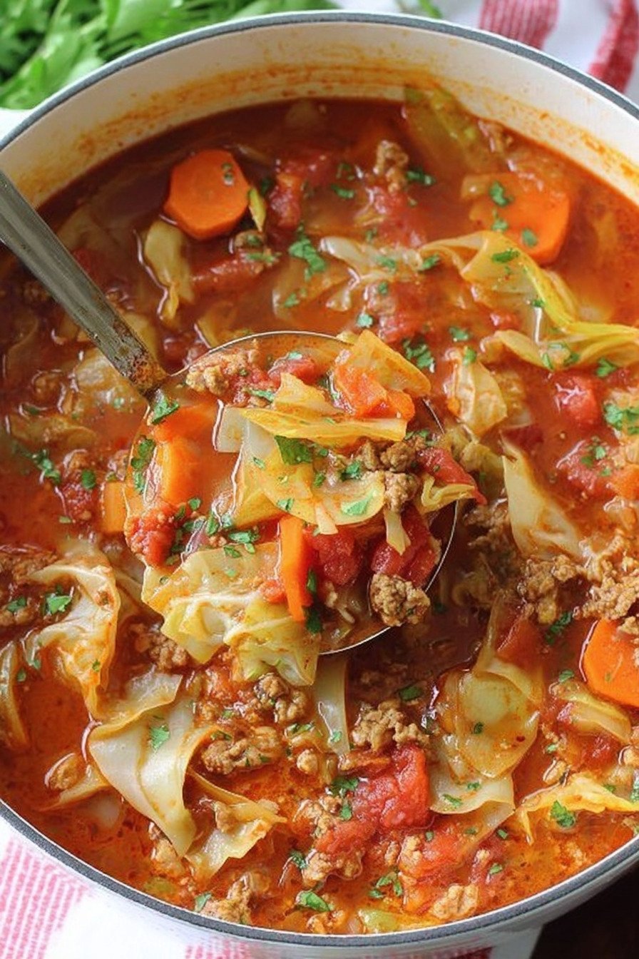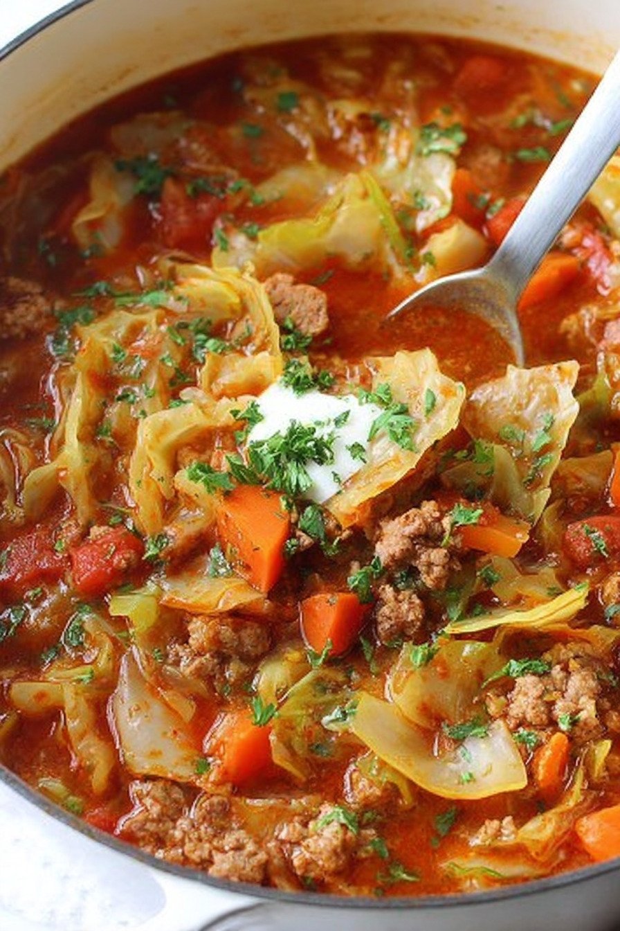 I make this soup when I want comfort without the heavy feel. It fits into Low Calorie Soup Recipes and still tastes rich and filling. We get cabbage, beef, tomato, and rice in one pot, which saves time and dishes.