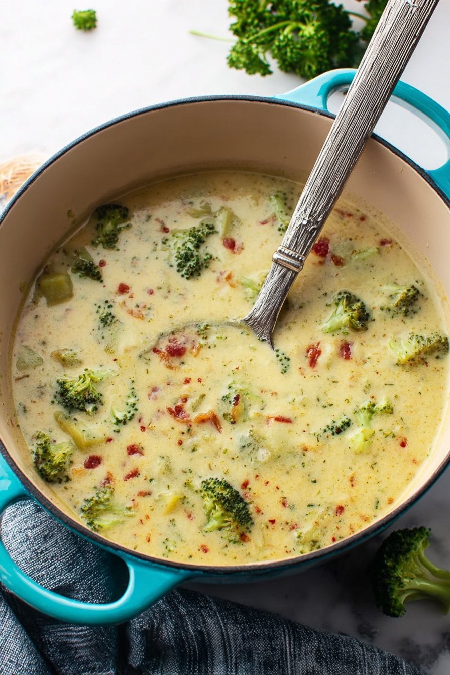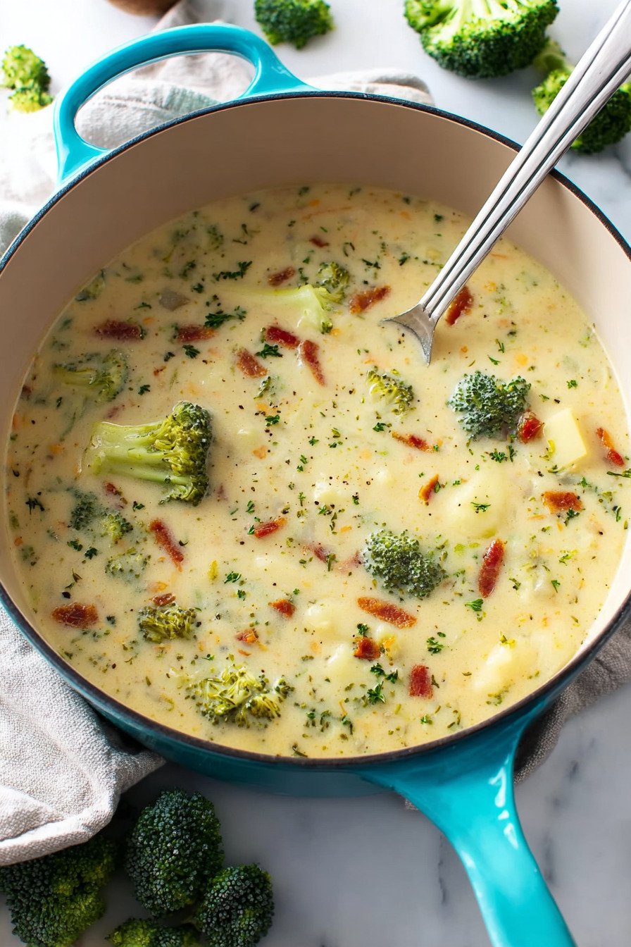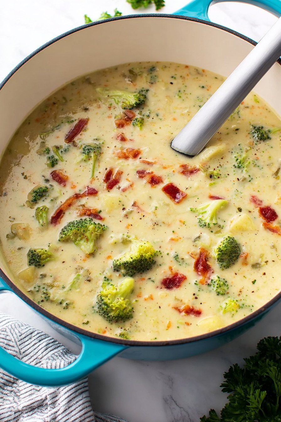 Pulse an immersion blender in short bursts. Stop before the soup turns gluey. A few fast pulses lift body and still keep bits of broccoli and potato in view. That balance reads like classic potato soup without heavy cream.