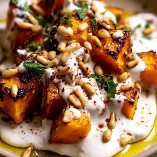 • This recipe turns pumpkin into a savory star with creamy yogurt and crunchy pine nuts.