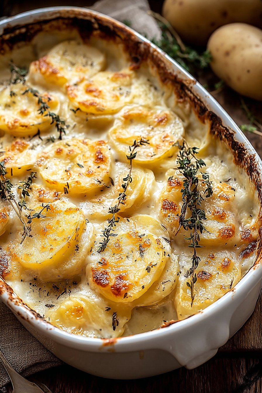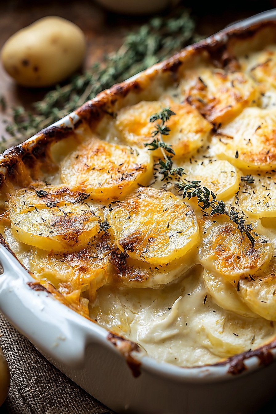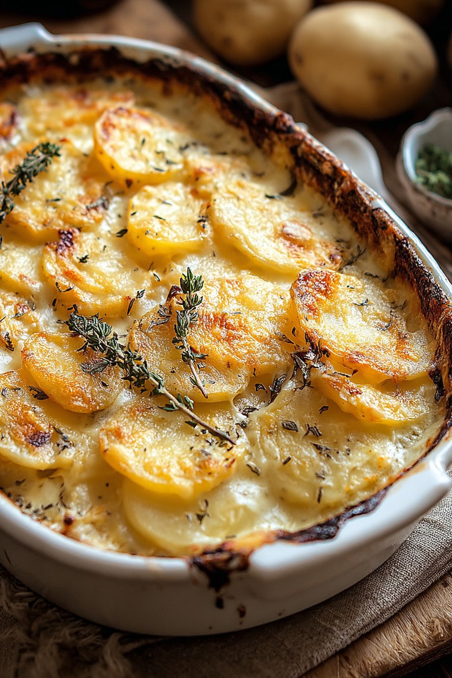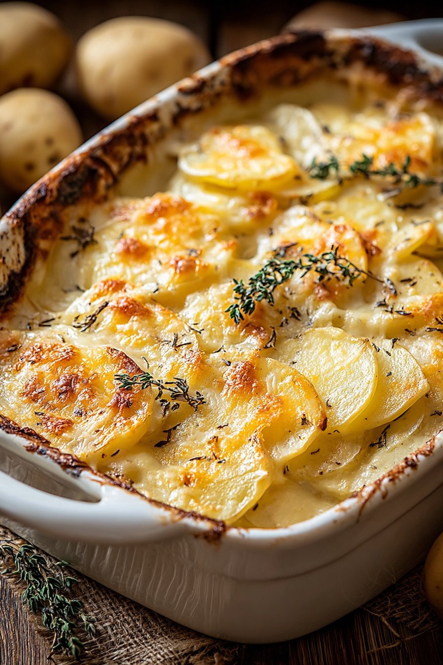 For a head start cook covered until the potatoes turn just tender then cool. Later bake uncovered to finish the color. This path keeps the top crisp and the base smooth. The texture stays gentle like a quiet cheesy potato gratin and the kitchen smells like a hug.