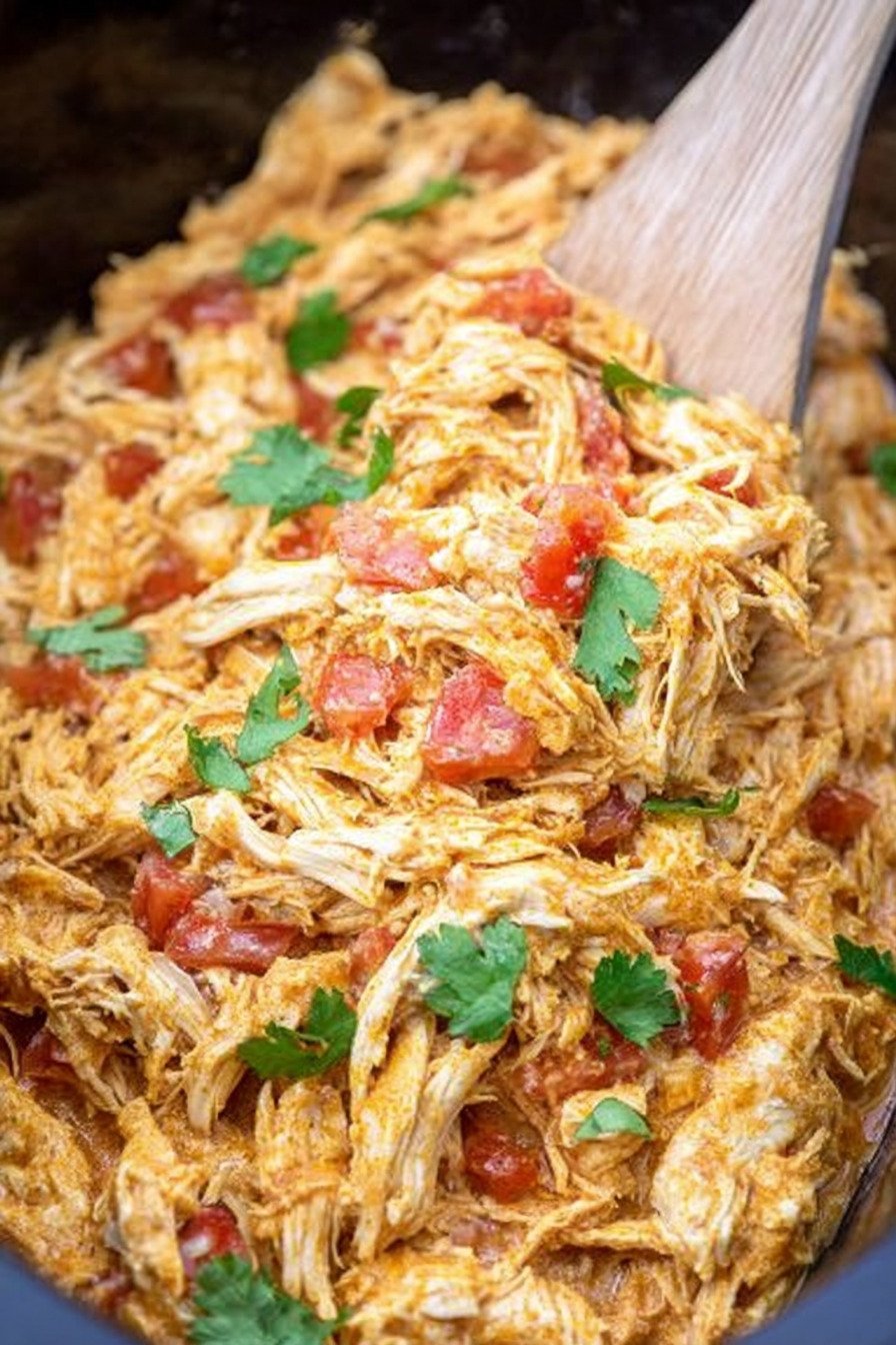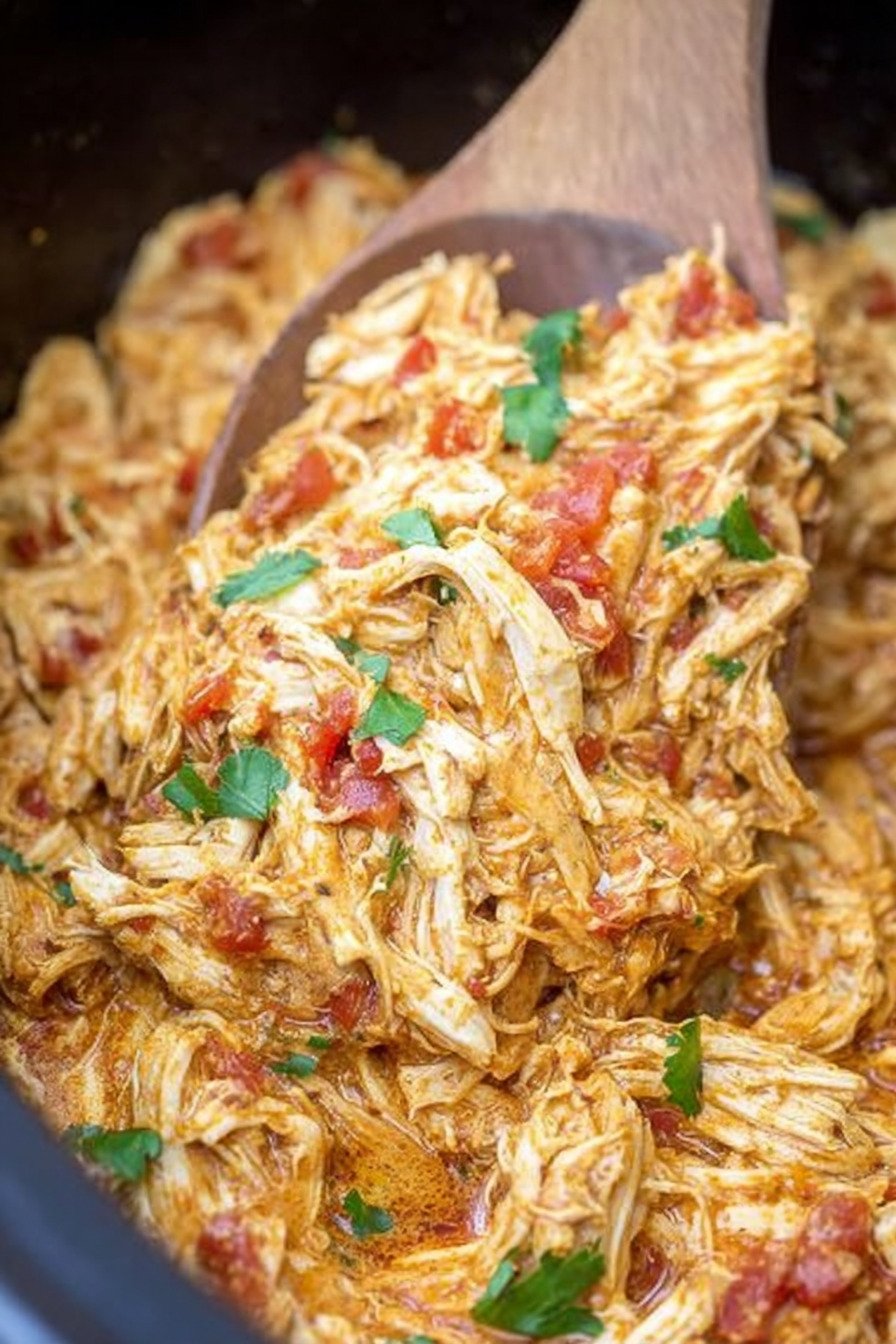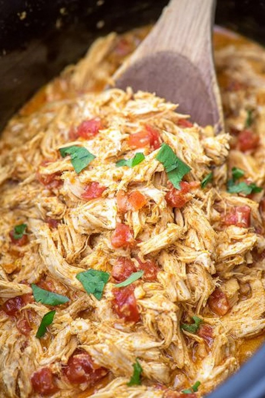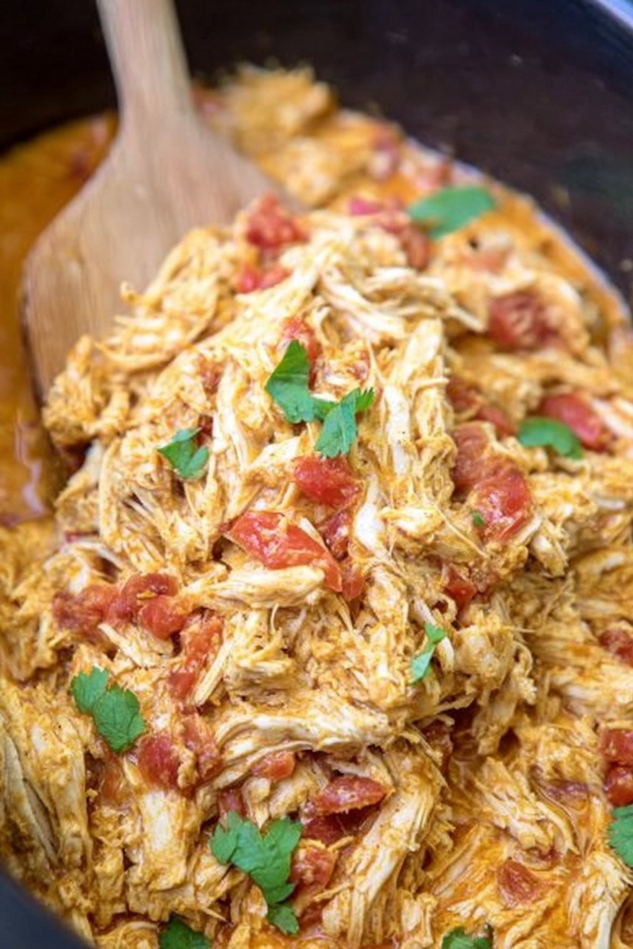Chicken rests in a warm bath of queso and tomatoes with green chiles. The spice mix brings a gentle kick and the cooker turns the meat tender. I shred in the pot and the sauce clings and shines.