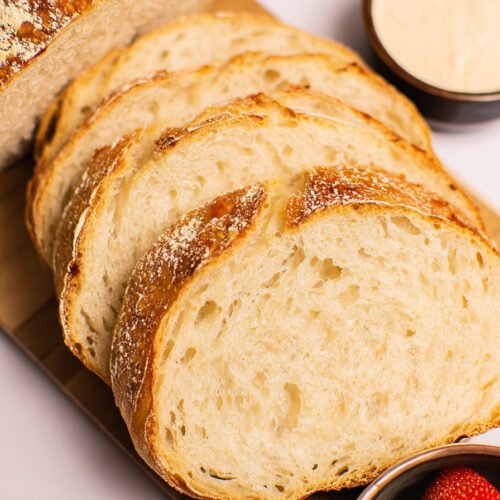 For longer storage slice and freeze flat in a bag. Reheat in a warm oven or a toaster. The sourdough bread recipe flavor still shines after thaw.