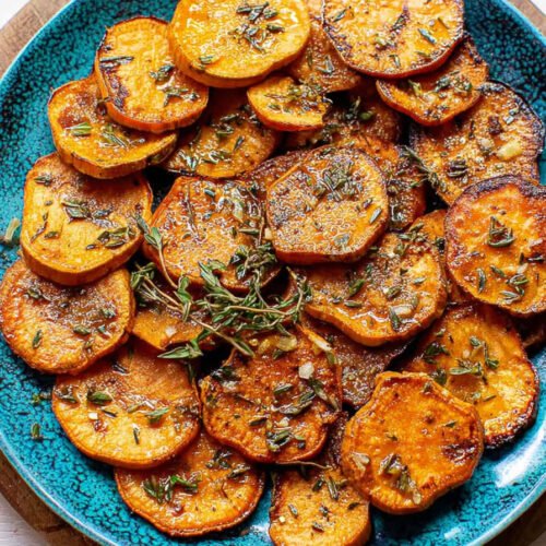 I have cooked a lot of sweet potato recipes over the years, yet this one keeps pulling me back. The edges turn crisp, the centers turn soft, and the garlic sinks deep into every bite. If you love baked sweet potatoes, herb roasted sweet potatoes, and garlic roasted vegetables, you will feel right at home here. We slice thick rounds, roast them hard, then let broth and herbs soak in. The pan smells warm and rich. It reminds me of big trays of roasted root vegetables my family shared on quiet Sunday nights. These are the kind of easy sweet potato recipes that fit busy days yet still feel special. I serve this when I want savory sweet potato dishes that taste honest and bold. The tops caramelize, the bottoms turn golden, and the garlic clings to your fingers in the best way. Grab a fork, lean over the pan, and tell me you do not sneak one before dinner. I always do.