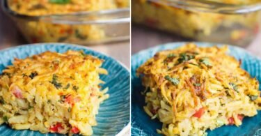 Vegan Breakfast Casserole with Hash Browns and Cheesy Sauce